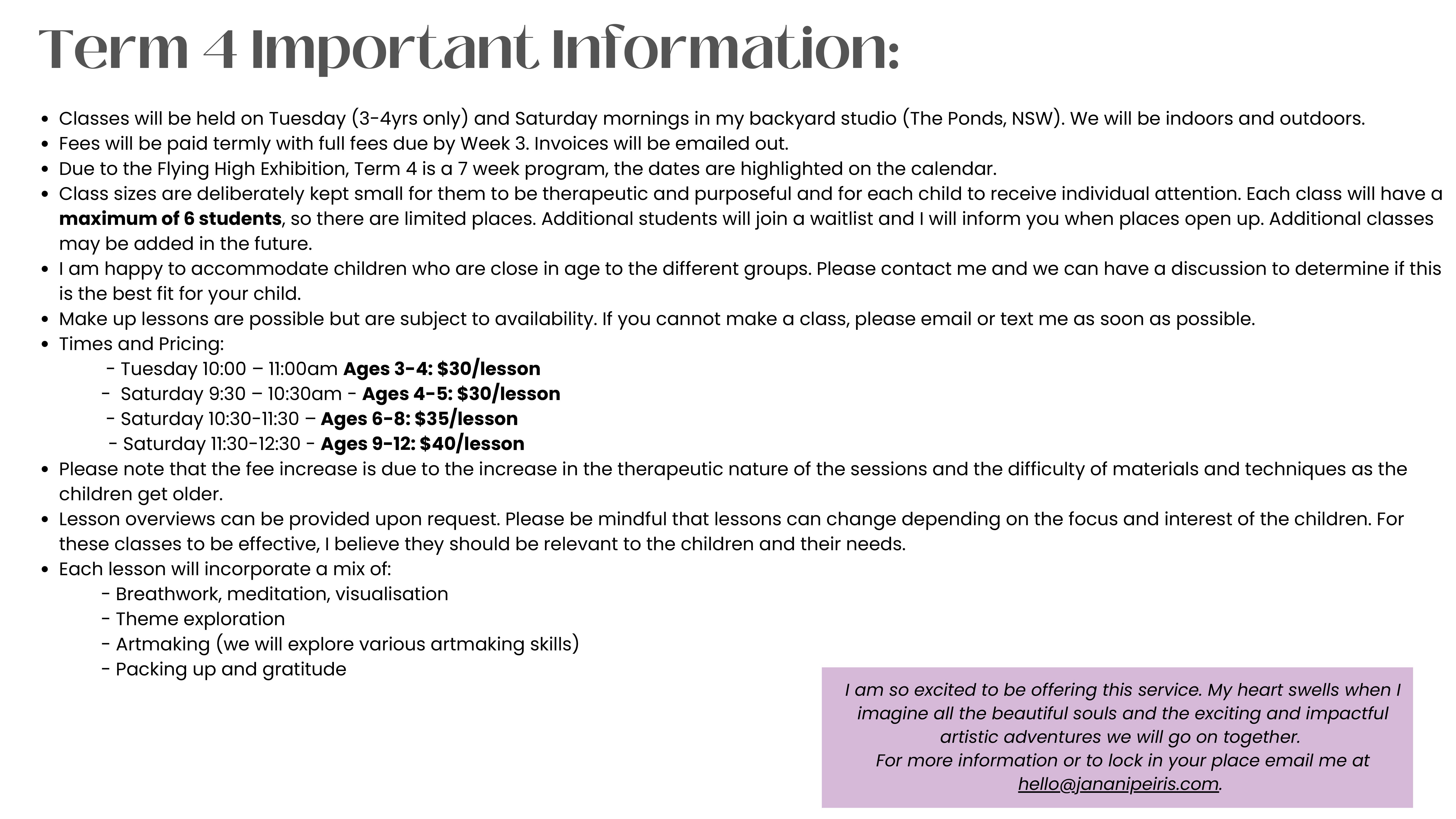 In Term 4, our classes will also be working towards the upcoming Flying High children’s art exhibition — a powerful opportunity for young artists to express their inner worlds and be part of a larger community initiative. It’s a wonderful chance for your child to not only grow creatively and emotionally, but also contribute to a meaningful event that celebrates the voices and visions of children. Due to the immense undertaking of the exhibition, Term 4 will be a shorter 7-week program.